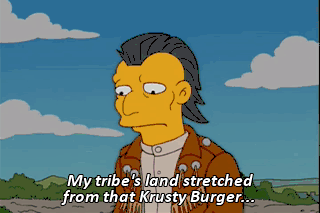 My tribe's land stretched from that Krusty Burger... down to Gary's Water Bed Warehouse.