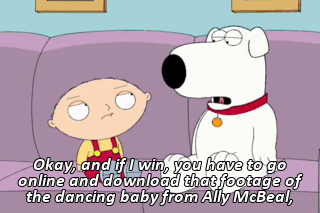 Okay, and if I win, you have to go online and download that footage of the dancing baby from Ally McBeal,