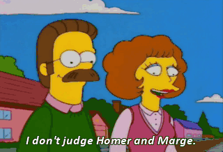 I don't judge Homer and Marge. - That's for a vengeful God to do. - Mm-hmm.