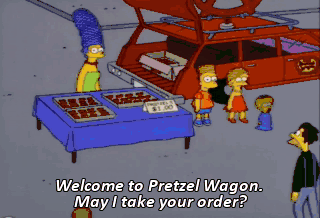 Welcome to Pretzel Wagon. May I take your order? Uh, let's see. I'll have one, uh-- Hey, hurry up. I wanna get my pretzel. - One pretzel. - Thank you. Let's see, uh,