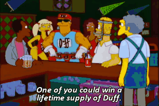 One of you could win a lifetime supply of Duff. Okay, chug monkeys. "What beverage brewed since ancient times... is made from hops and grains?"
