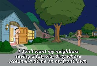 I don't want my neighbors seeing a fat, old, dirty whore screaming at me on my front lawn.