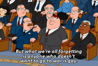 But what we're all forgetting is anyone who doesn't want to go to war is gay. I want to go to war. (All) Oh, yes, yes, yes. We should definitely go.