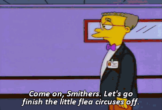 Come on, Smithers. Let's go finish the little flea circuses off. Except for Little Monty, of course. Mmm! We gotta get the dogs out of there! Shh! Hush, puppies. We gotta get you out of here.