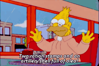 Two ration stamps and an artillery shell full of oleo! What's your nostalgia prize, Grampa? Liberace action figure! Party tonight at Roddy McDowall's. Whoo. I got a plastic Krusty-saurus.