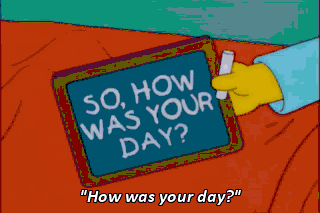 "How was your day?" Do you really wanna know? Uh-huh. Well, let's see. I was in the kitchen counting the corncobs on the curtains... Uh-huh. when who should ring the doorbell but Ned Flanders.
