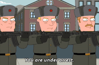 You are under arrest. Time to lose this costume. (LAUGHING) 'Cause we're in Russia!