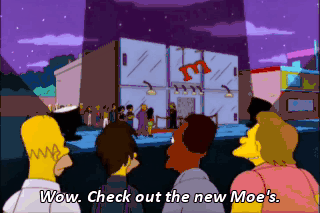 Wow. Check out the new Moe's. Wow. It looks like an alien headquarters. Couldn't you just see aliens running outta there? Couldn't ya? Hey, wait up!