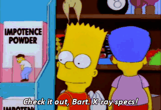 Check it out, Bart. X-ray specs! Hey, these don't work. Uh-- Oh, a lead shirt. I'll take three pairs. Here's my prescription. Hmm.