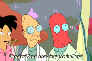 Bender! Stop shutting the hell up! Right. Leela's back, as if I care. (SARCASTICALLY) Whoo! All right, Leela! (ALL CHEERING)