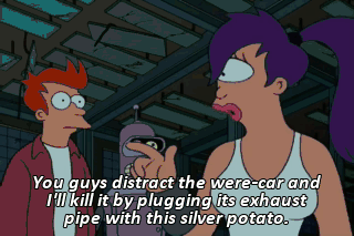 You guys distract the were-car and I'll kill it by plugging its exhaust pipe with this silver potato. Psst! There it is. It looks so unhappy.