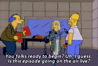 You folks ready to begin? Uh, I guess. Is this episode going on the air live? No, Homer. Very few cartoons are broadcast live. It's a terrible strain on the animators' wrists.