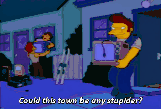 Could this town be any stupider? Order! Please rise for the, uh, Pledge of Allegiance. Get to the money! In a moment.