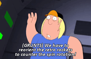 (GRUNTS) We have to reorient the retro rockets to counter the spin rotation!