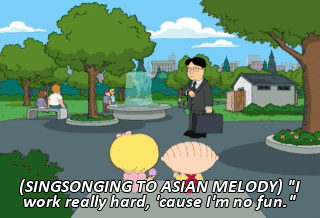 (SINGSONGING TO ASIAN MELODY) "I work really hard, 'cause I'm no fun." (IMITATES GONG)