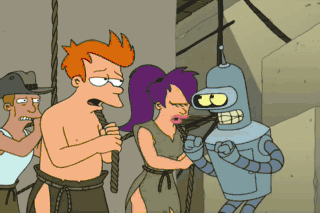 Work faster-- like this! You call that motivating me? Don't just whip with your arms. The power comes from your hips. Like this! Ow! Bender, quit giving the slave drivers pointers.