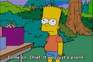 Come on, Chief. It was just a prank. Would some flatware make things right? Um, what does it say on my badge? (READING) Let's go. (BART SIGHS) Bart, the record of your mischief is staggering.
