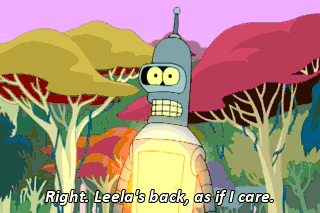 Right. Leela's back, as if I care. (SARCASTICALLY) Whoo! All right, Leela! (ALL CHEERING) (SIGHS) Thanks. It's so nice to wake up and see... (GASPS) Leela! Leela? Leela? Leela. How is this possible?