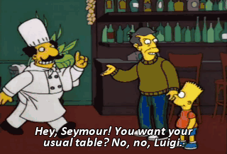 Hey, Seymour! You want your usual table? No, no, Luigi.