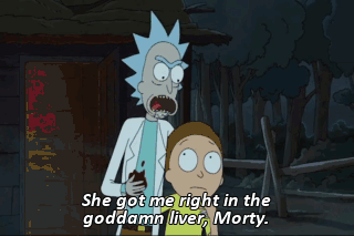 She got me right in the goddamn liver, Morty. It's the hardest-working liver in the galaxy, Marty, and now it has a hole in it. I hope it was worth it.