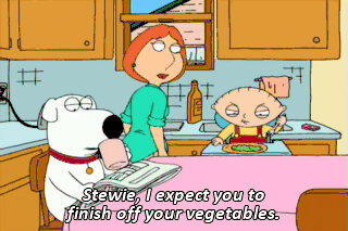 Stewie, I expect you to finish off your vegetables. Rest assured, you relentless harridan, I expect I shall finish them all off! And you as well!