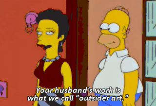 Your husband's work is what we call "outsider art." It could be by a mental patient or a hillbilly or a chimpanzee. In high school I was voted most likely to be a mental patient, hillbilly or chimpanzee!