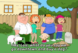 Hey, Lois, what do you say we go downtown and buy a dog? Hey, wait a minute. You already have a dog. So long, Puss. We'll miss you. It's gonna be quite a different place with him gone. That's for true.