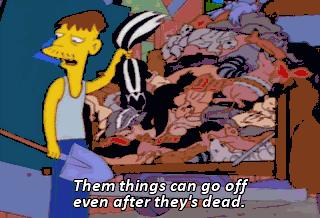 Them things can go off even after they's dead. Hmm. Young man, there's nothing funny about novelties. I mean, they're humorous and all,
