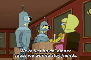 We're just havin' dinner 'cause we wanna stay friends. Ah, I knew that. What I'm actually outraged by is your choice of wine! Really, it's the steward's fault.