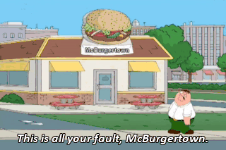 This is all your fault, McBurgertown. You and your delicious hamburgers. I swear, I'll get back at you someday for what you did to me and what you did to Wimpy!