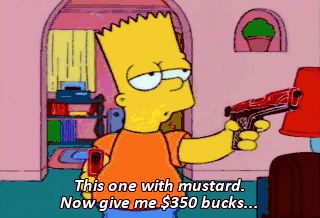 This one with mustard. Now give me $350 bucks... or you're gonna be a mess for your date. You don't have the guts. Here. Take your money. Take it. Now, the tables have turned, haven't they?