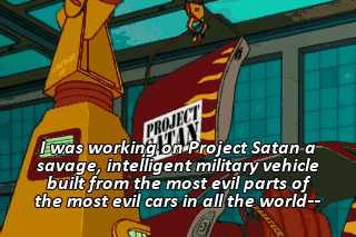 I was working on Project Satan a savage, intelligent military vehicle built from the most evil parts of the most evil cars in all the world--