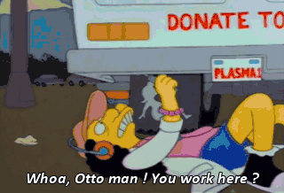Whoa, Otto man ! You work here ? Oh, yeah. During the day, all my friends are in school. So I got a job as a certified bloodletting tech dude ! Now, let's get the show on the road. Okay. Let me wash up.