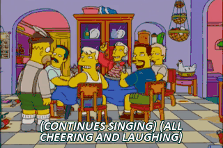 (CONTINUES SINGING) (ALL CHEERING AND LAUGHING) This is all my fault. I'll never eat junk food again. I swear!