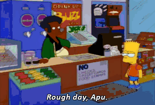 Rough day, Apu. Pump me a squishee and don't spare the syrup. Perhaps you'd like to try an experimental flavor of mine-- a delicious chutney squishee. Uh... Okay.