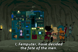I, Femputer, have decided the fate of the men. Femputer sentences them to death... by snu-snu! Yeah! Whoo-ooh! What are you, gay?