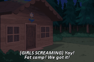 (GIRLS SCREAMING) Yay! Fat camp! We got it! Oh, no, a gust of wind! (WIND HOWLING) Oh, Chris, sweetie, I'm so glad you're here, safe and sound. Me, too, Mom.