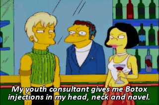 My youth consultant gives me Botox injections in my head, neck and navel. Hiya, pal. So, how 'bout them current events? Oh, you got one of them cell phones, huh? Yeah. No cord at all on those. Hey, game's on!
