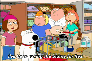 I've been taking the blame for Rex. Eww! It's everywhere! It's ok. Meg, hand me my sweater. Jeez, Brian, where do you think you are? Payless? I say, I say, Paco, grab a mop.