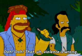 Ooh! Ooh! That, uh, violence is wrong. Excellent, Ramrod. Civilized people solve their disputes with words. Homer, stop! No, you don't understand.