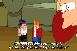 (SNIFFLES) My soul mate is gone. Why should I go on living? Because the pain slowly fades, but the love is forever. Yow!