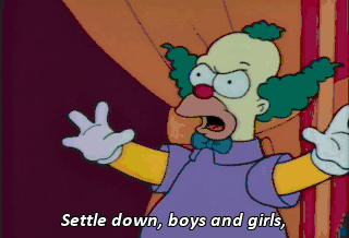 Settle down, boys and girls, or Krusty will have to bring out his old friend Corporal Punishment again. Please, stop it ! Wha-- Who are you people ?