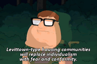 Levittown-type housing communities will replace individualism with fear and conformity. What do you think of that new kid at school, Marty McFly? Seems like he just showed up out of nowhere.