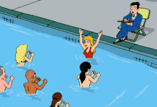 Ok, come on, everyone. Exercise is an important part of recovery. Just work with the resistance of the water. 10 more reps. Ok, and one, and 2, and 3... Yeah! I'm also addicted to boobies!