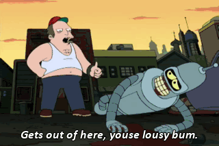 Gets out of here, youse lousy bum. Please, I'm scared. We're all scared. It's the human condition. Why do you thinks I put on this tough-guy facade? Now, beat it!