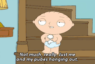 Not much, really. Just me and my pubes hanging out. Oh, dear God. Boy, I am so beat from doing adult stuff all day. So am I. (STRETCHING) I just kind of feel like kicking it tonight.