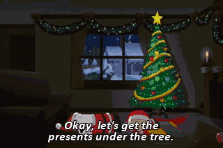 Okay, let's get the presents under the tree. All right, you have 'em? I thought you had them. For the love of Christ, they're still in the sleigh! Crap. On the roof? (CREAKING) No, it's in the yard.