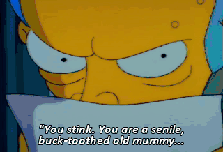 "You stink. You are a senile, buck-toothed old mummy... with bony girl arms, and you smell like an elephant's butt !"