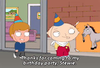 Thanks for coming to my birthday party, Stewie. I wouldn't have missed it for anything. I've never been to a party before. Want to watch me blow out the candles? I would love to see that. And gosh, Bobby,