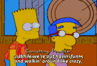 While we're out havin' fun and walkin' around like crazy, those teachers are cooped up in school like morons! Mmm, here we go again. Skinner! Ah. No day would be completely wasted without a visit...